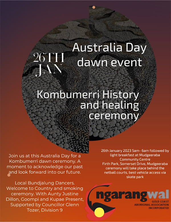 Division 9 Councillor, Glenn Tozer, is helping to promote the event in collaboration with Ms Dillon, Goompi (respected and recognised artist, teacher and community mentor), and Max Dillon (Kupae Girramun Galeen Kombumerri Nunukul).