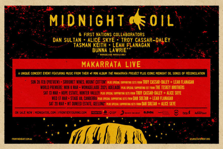 Midnight Oil will perform a handful of special outdoor concerts called Makarrata Live this February and March. The band will be joined on stage by an incredible line up of First Nations collaborators for a unique concert event featuring music from their number 1 mini-album 'The Makarrata Project' plus iconic Midnight Oil songs of Reconciliation from throughout their career.